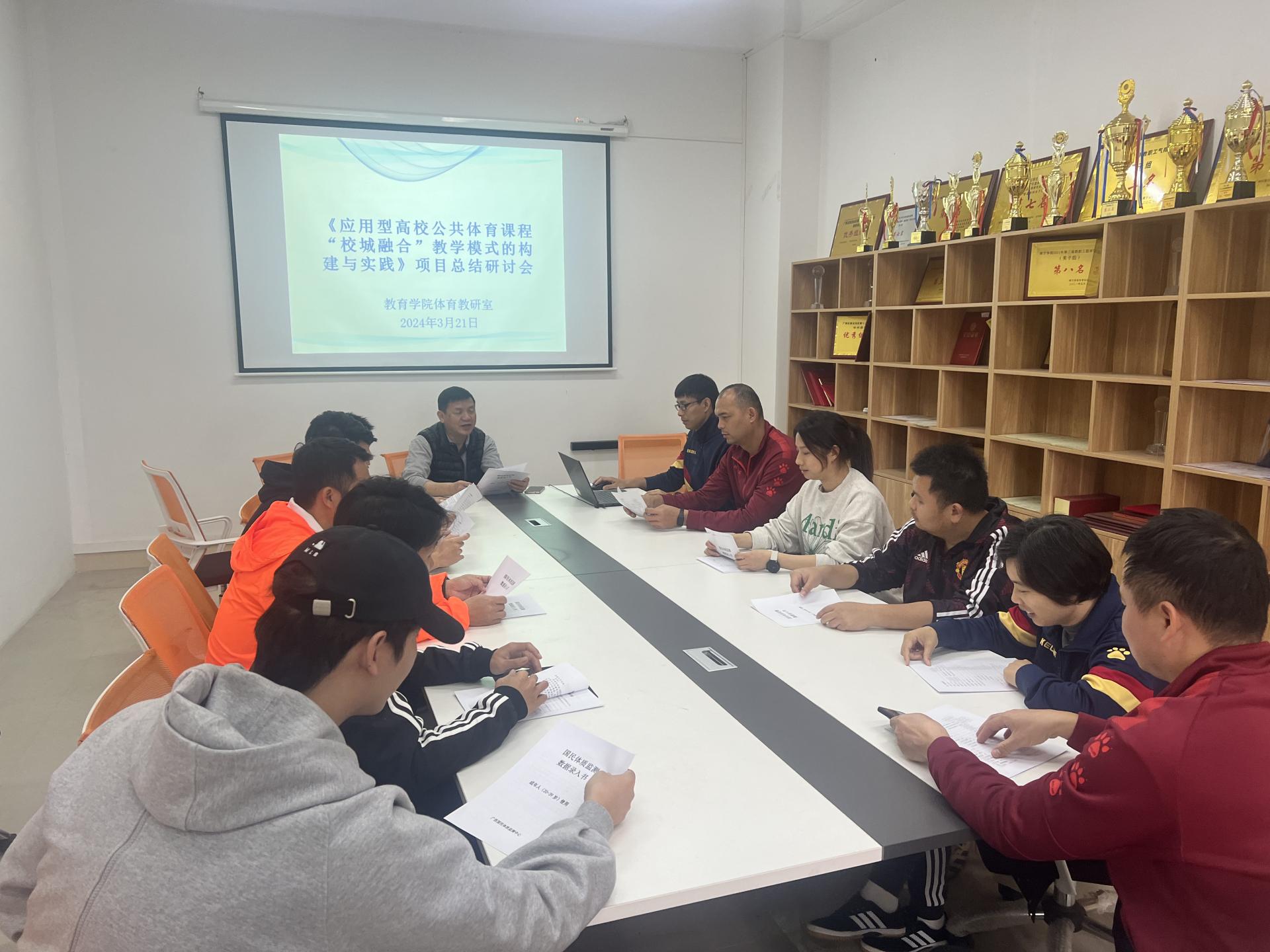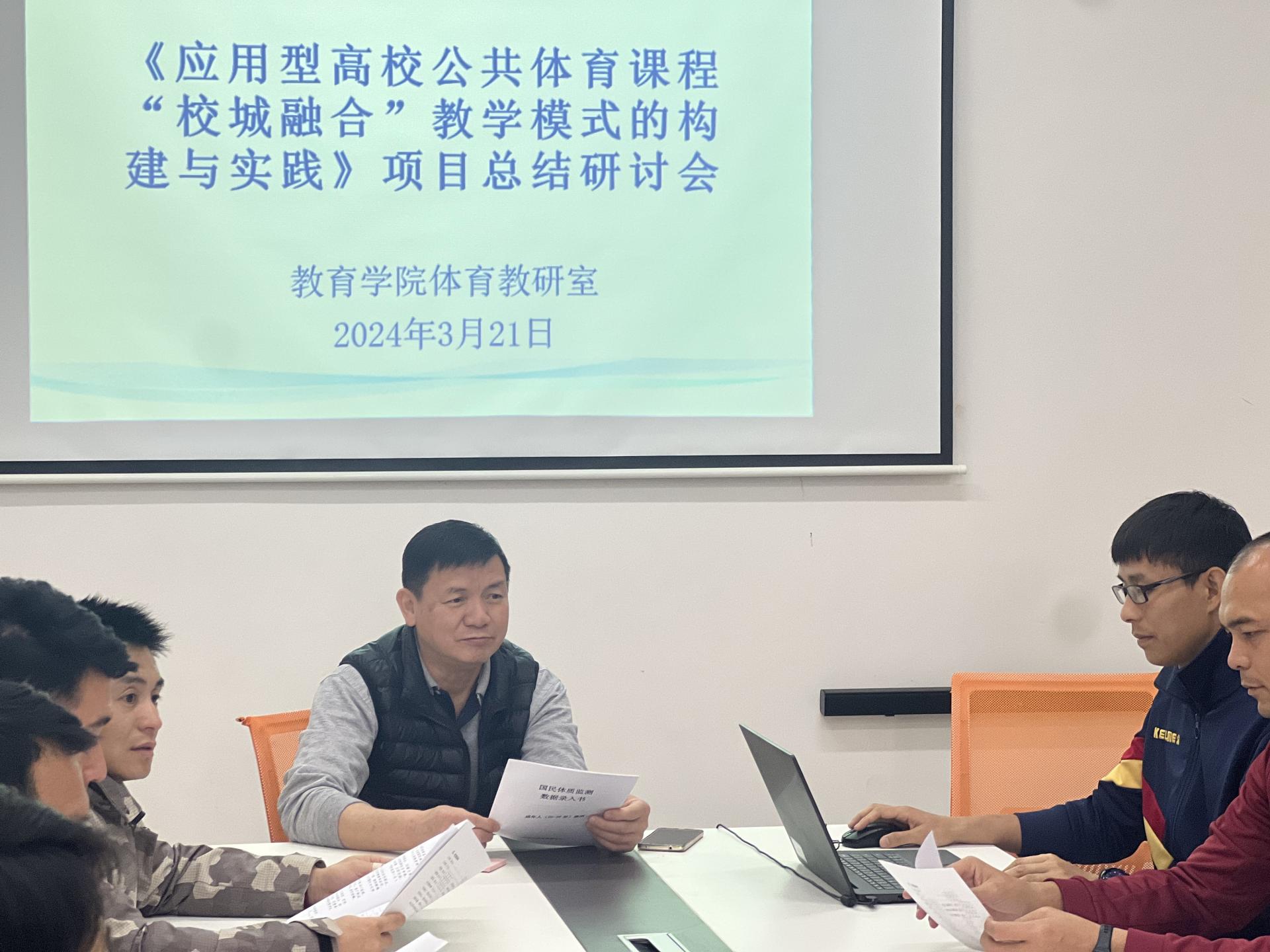 2024年3月21日,教育学院体育教研室《应用型高校公共体育课程“校城融合”教学模式的构建与实践研究》项目团队在体育教研中心会议室召开课程改革总结研讨会。会议由项目负责人莫彬琳老师主持,体育教研室全体教师参加了会议。