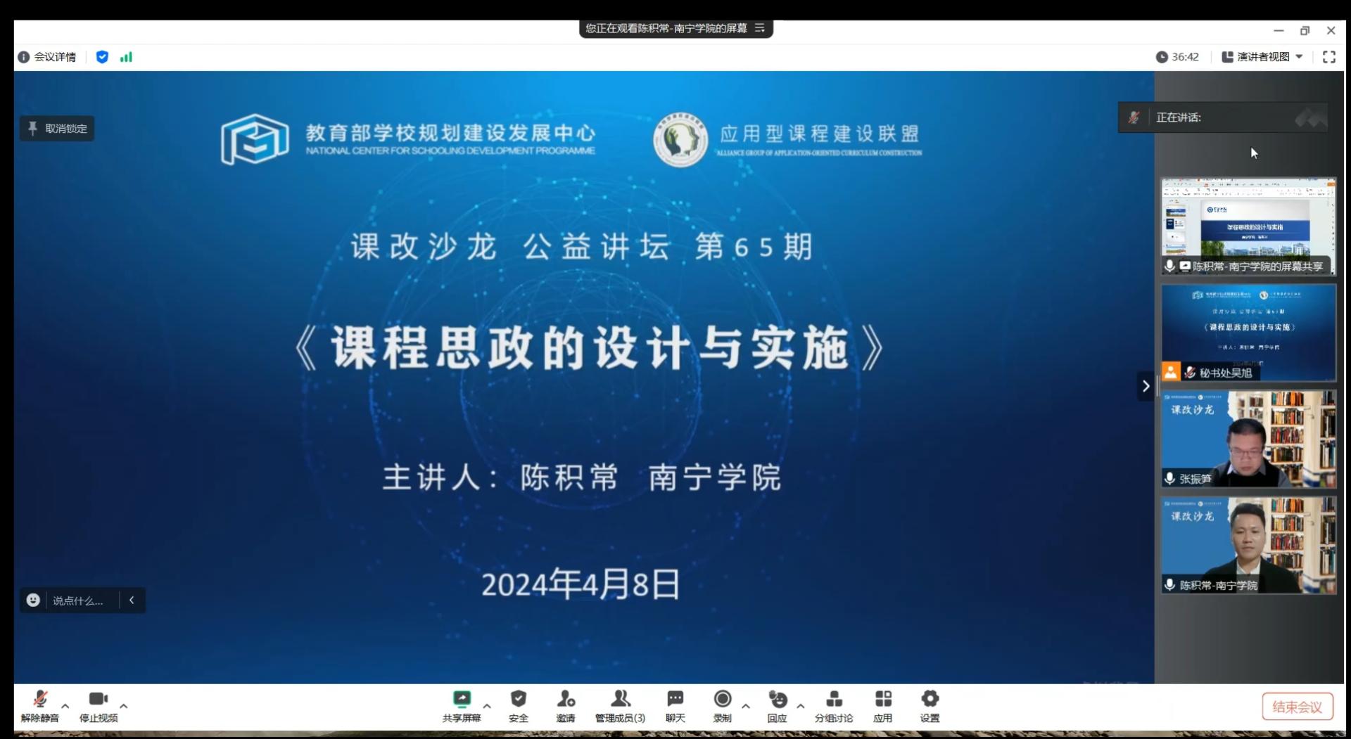 4月8日,由教育部学校规划建设发展中心、应用型课程建设联盟主办的“课改沙龙”活动在线上召开。本次课改沙龙聚焦“课程思政”主题,我校信息工程学院陈积常教授做“课程思政的设计与实施”主题报告分享,会议由应用型课程建设联盟秘书长张振笋教授主持,线上参会人数达到2000多人次。