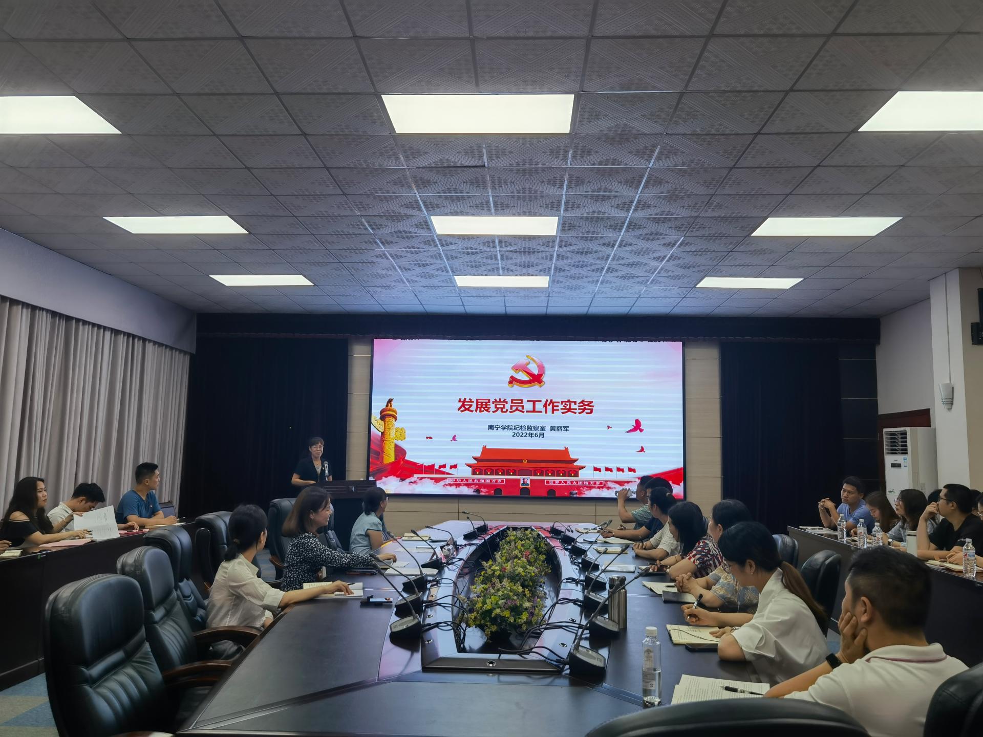 赵田英同志介绍了此次发展党员工作专题培训会的背景及目的,传达了自治区党委教育工委2022年发展党员工作有关文件精神,同时对今年的发展党员工作提出了四点要求:一是准确把握要求,二是突出结构优化,三是严格标准程序,四是认真学习培训。接着,学校纪检监察室主任黄丽军同志作《发展党员工作实务》专题培训。黄丽军主任从发展党员工作的总体要求、相关政策、基本程序及常见问题三个方面,结合丰富的实际工作案例,对发展党员工作的5个阶段25个步骤进行充分和详尽的讲解。最后,在场的党务工作人员开展座谈交流,对实际工作中的重点及难点问题进行了探讨。