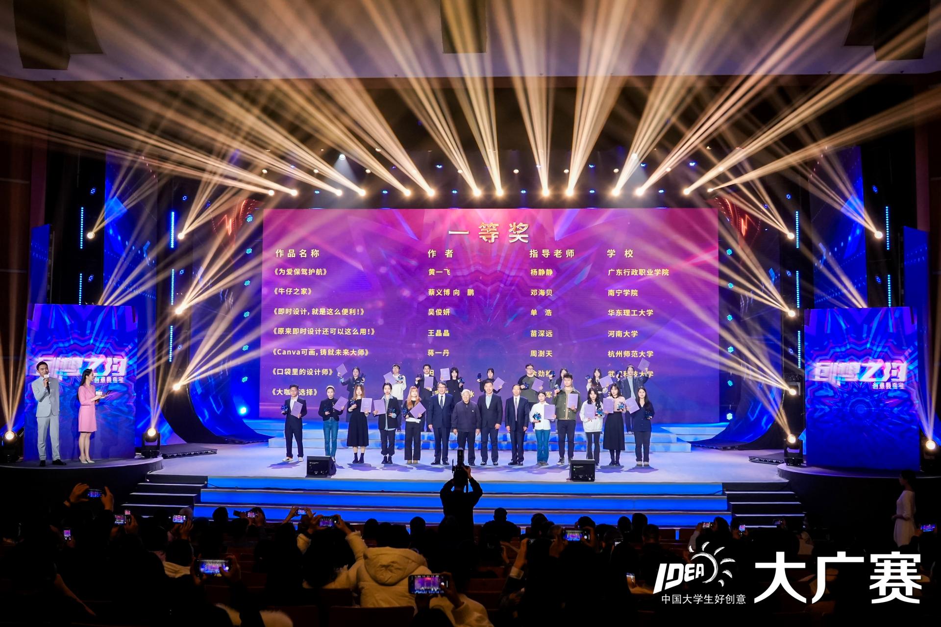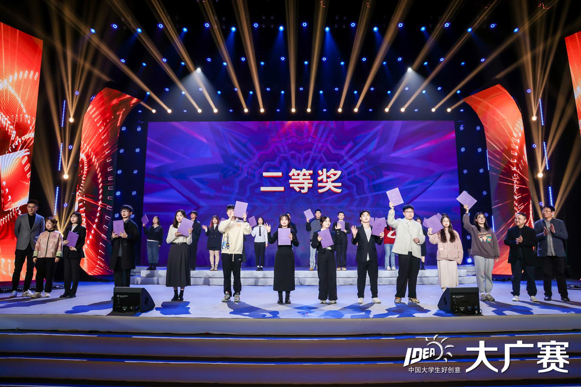 本次颁奖盛典颁发了全国一等奖、全国二等奖、优秀指导教师、优秀组织工作者、优秀院校、优秀赛区、优秀指导单位等奖项。从全国93万余组作品中脱颖而出,2020级视觉传达设计4班同学蔡义博、向鹏同学携手完成的平面类作品《牛仔之家》荣获全国总评审一等奖,2021级视觉传达设计5班李国豪、张蜜、曾尧同学合力完成的广播类作品《联通沃“派”》荣获全国总评审二等奖,邓海贝老师继上一年度获得全国总评审“优秀指导教师”后,本届继续获得此殊荣。