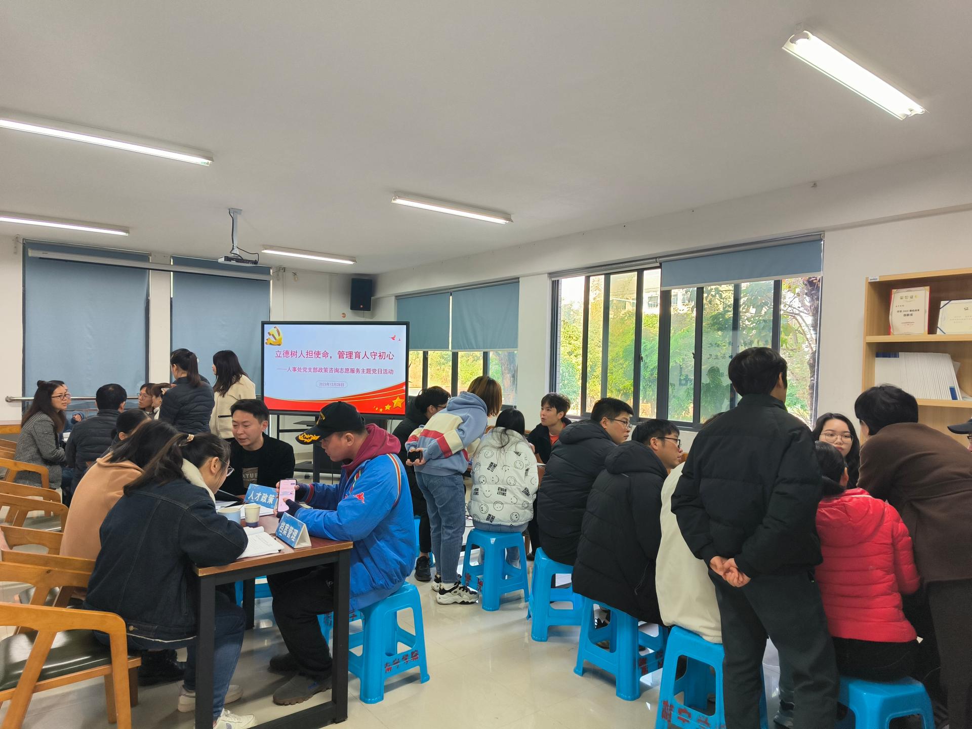 为贯彻落实党的二十大精神,践行全心全意为人民服务的根本宗旨,充分发挥党组织战斗堡垒作用和党员先锋模范作用,人事处党支部坚持立足岗位作贡献,积极开展党员志愿服务活动,于2023年12月28日上午,在行政楼125会议室开展了政策咨询服务主题党日活动,现场为教职工解答党建工作、人事人才工作的相关问题,为50余人次提供了咨询服务。