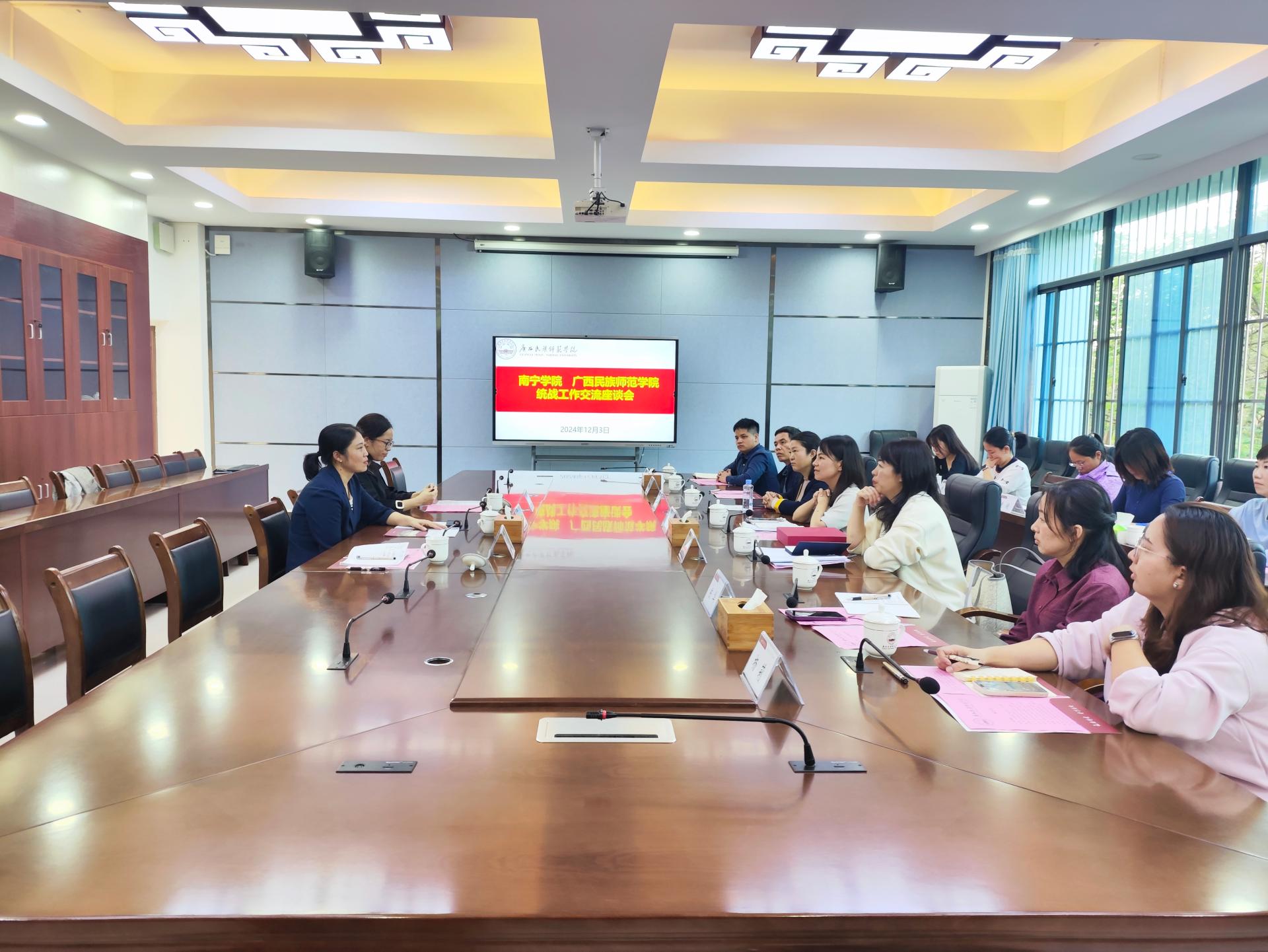 在“第六批自治区民族团结进步示范学校”广西民族师范学院,我校统战干部参观了校史园,详细了解了广西民族师范学院85年的悠久办学历史和近年来的发展情况;在木棉园通过石刻文字和雕塑再次重温中国共产党建党以来的历史脉络,接受了一次牢记初心使命、赓续红色精神的党性教育;在崇左市首个党外知识分子统战工作实践创新基地中的“一榫一卯·匠心成器”桂西南高端家居设计产业学院红木家居设计展和党外知识分子(程俊)木作工作室,实地考察了广西民族师范学院在团结党外知识分子和引导他们发挥优势方面取得的最新成果。在座谈交流会上,广西民族师范学院党委统战部部长、党委(校长)办公室主任赵琴致欢迎辞,党委统战部副部长梁洁详细介绍学校统战工作开展情况,与我校统战干部就铸牢中华民族共同体意识教育、民族团结进步创建、党外知识分子思想引领、统战工作品牌培育进行深入交流研讨。我校统战部部长赵田英向广西民族师范学院统战部赠送学校特色纪念品,为深化双方学校的联系和友谊,进一步推动两校统战工作共同发展奠定了坚实基础。