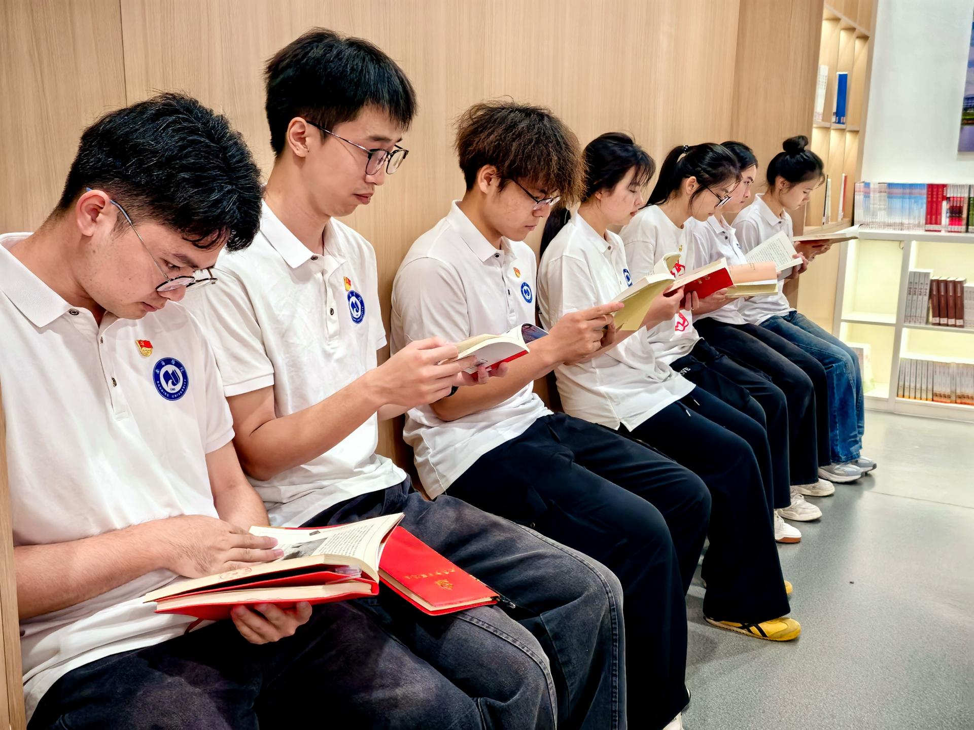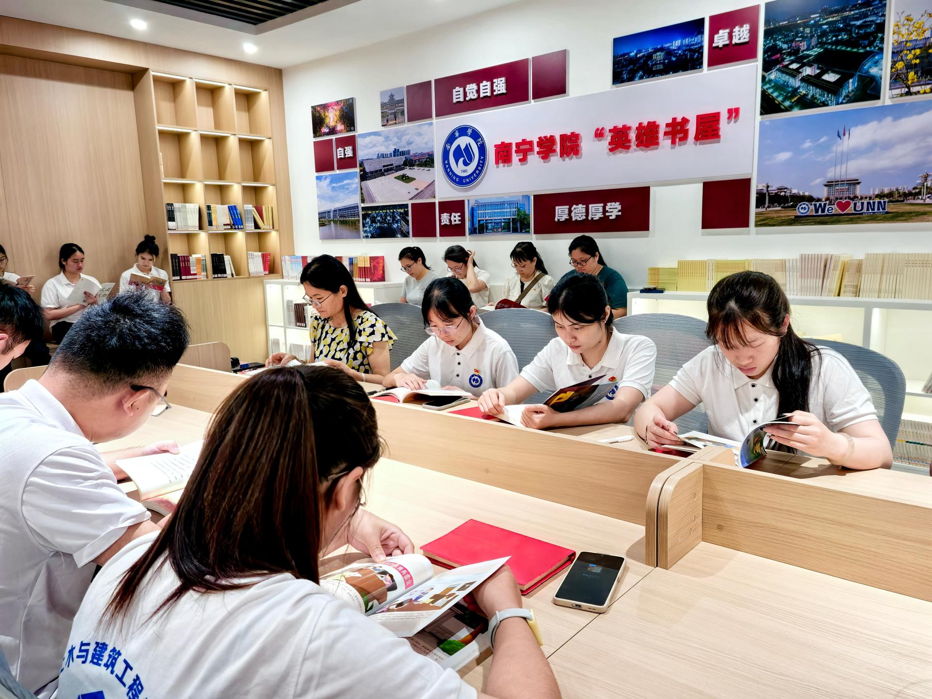 参观完毕英雄精神传承体验馆,图书馆党支部的党员同志们及土木与建筑工程学院的学生党员来到英雄书屋,一同进行沉浸式阅读。在阅读过程中,师生身临其境地体验了中国共产党发展历程,深刻感受到了红色革命文化的深厚底蕴。