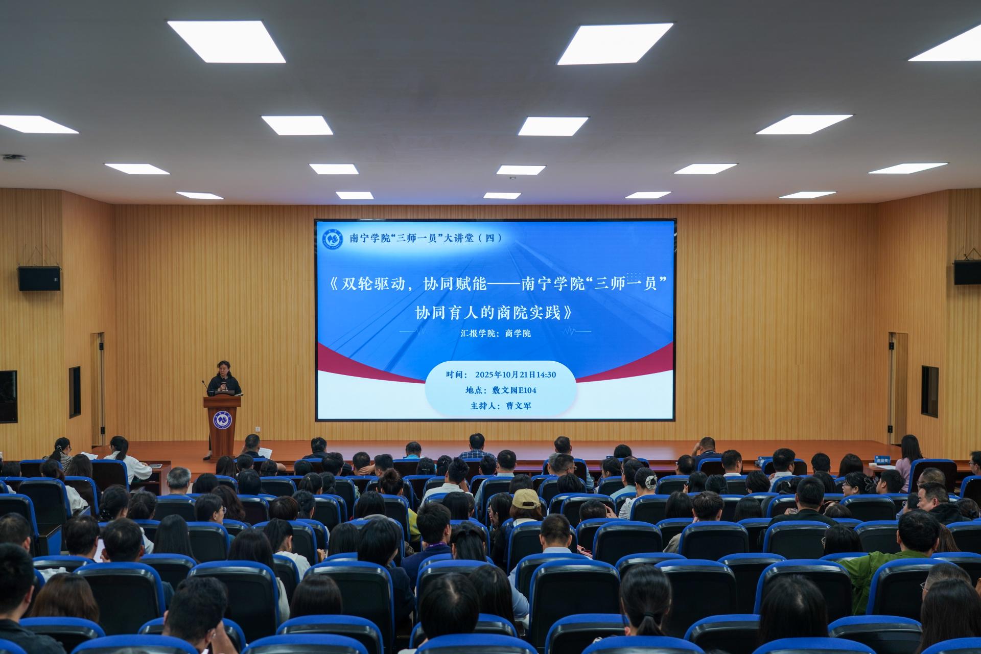 在全面落实立德树人根本任务、深入推进“三全育人”综合改革的时代背景下,qm球盟会持续探索育人机制创新,着力构建特色鲜明、实效显著的学生成长支持体系。10月21日,学校在敷文园E104报告厅成功举办“三师一员”大讲堂第四讲。本次活动由学校纪委书记曹文军主持,特邀商学院进行专题分享。学校领导班子、各职能部门与二级学院负责人及教师代表齐聚一堂,共同探讨协同育人的实践路径与未来方向。