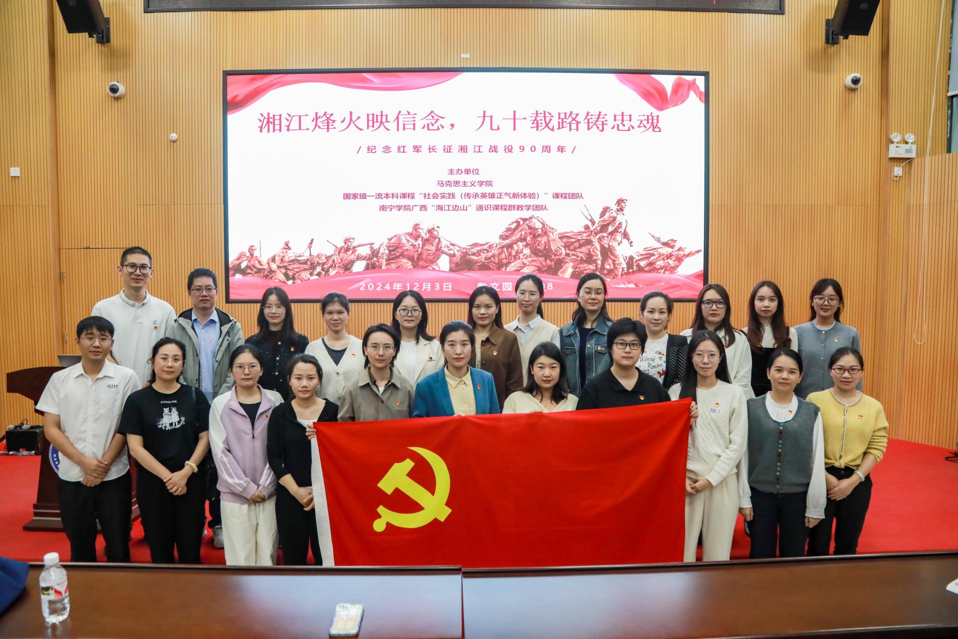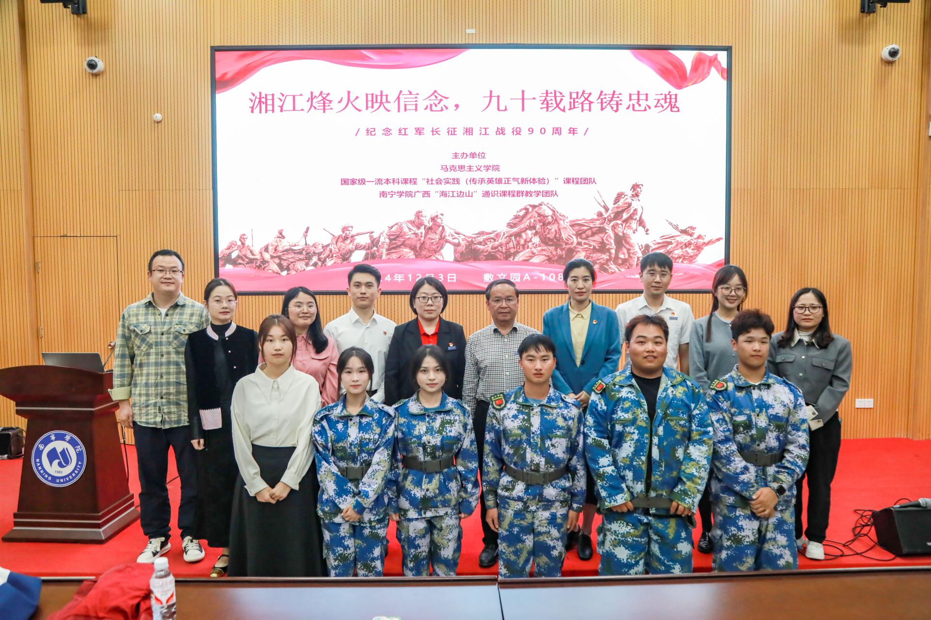 在红军长征湘江战役90周年之际,为弘扬伟大长征精神,充分发挥基层党组织战斗堡垒和党员先锋模范作用,引导广大党员和师生感悟信仰伟力,赓续红色血脉。在马克思主义学院党总支的组织下,2024年11月至12月,马克思主义学院思想政治理论课实践教学课程团队携手国家级一流本科课程“社会实践(传承英雄正气新体验)”和qm球盟会广西“海江边山”通识课程团队,联合开展“湘江烽火映信念,九十载路铸忠魂——纪念红军长征湘江战役90周年”系列活动。