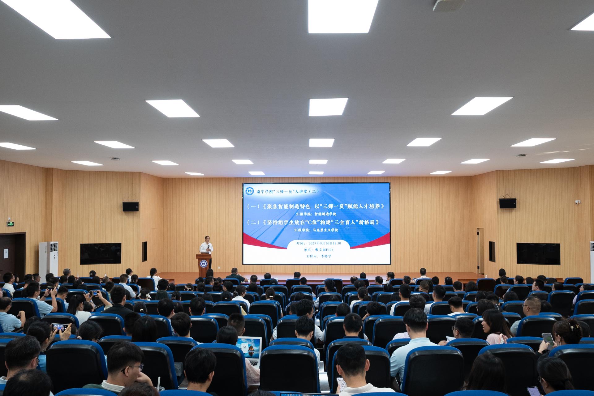 本期大讲堂由校长李栋学主持,校领导班子、相关职能部门与各专业二级学院负责人及全体辅导员、班主任参加会议。活动特邀智能制造学院与马克思主义学院同台分享,分别从“工科赋能”与“思政引领”的维度,生动演绎了“三师一员”如何在不同学科领域落地生根,形成育人合力。