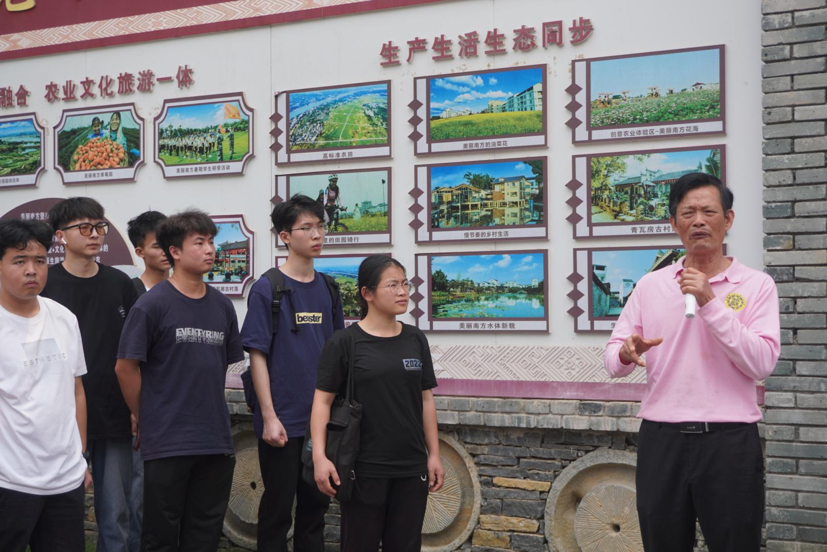 忠良村委会副主任梁安芝为师生介绍美丽南方创业历史