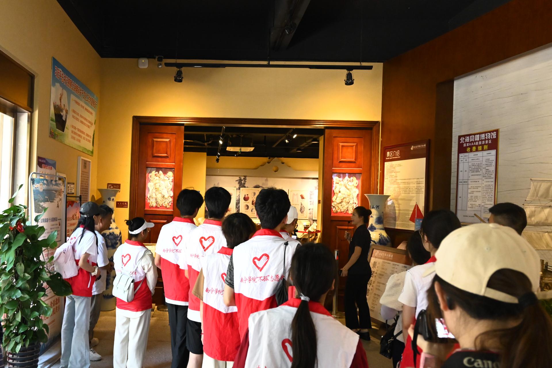 博物馆讲解员讲解贝雕的历史脉络