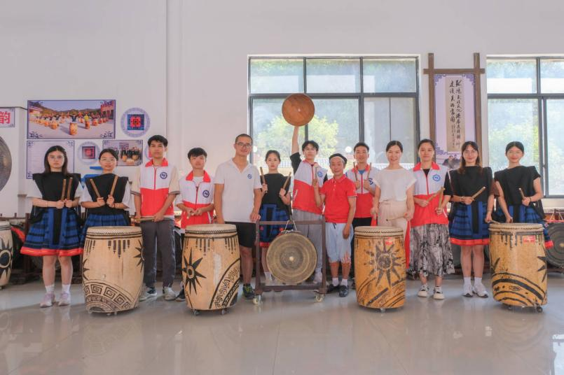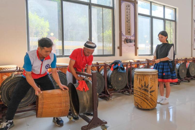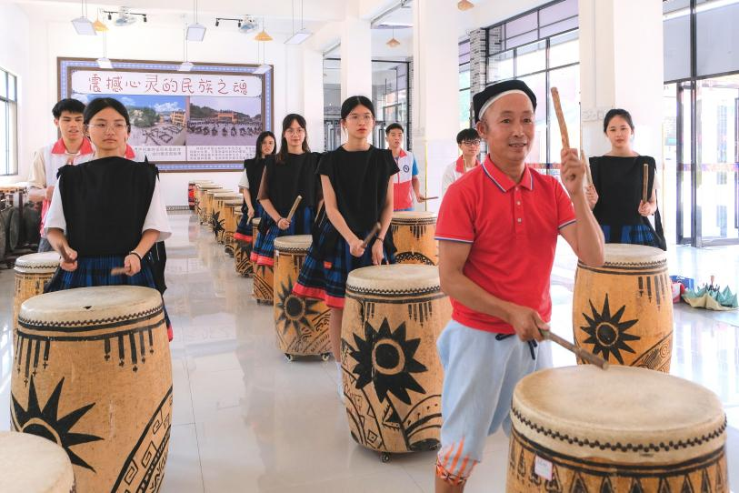 勤泽格拉非遗传承人黎明友老师教先锋队员敲铜鼓