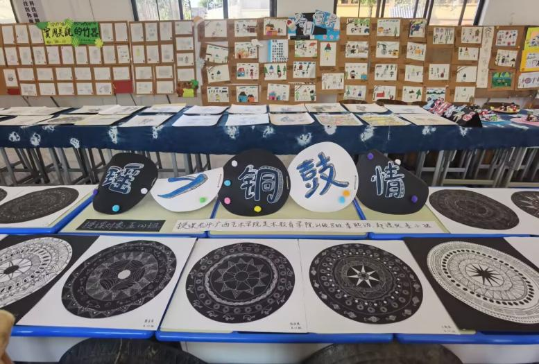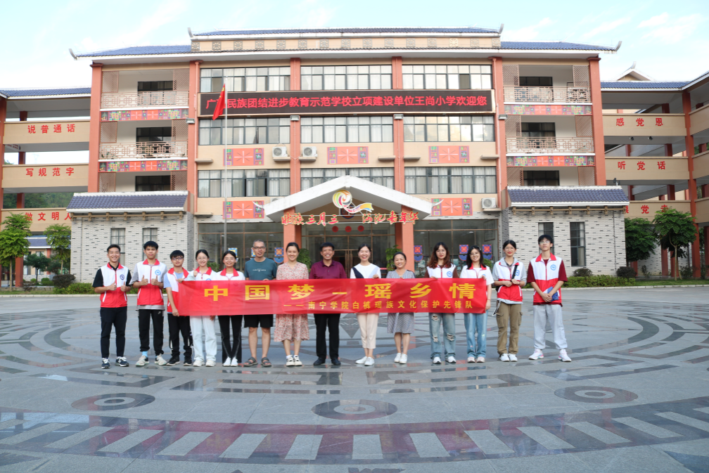 7月14日,先锋队来到了南丹县里湖瑶族乡白裤瑶民族文化传承发展成效显著的教育示范学校——王尚小学进行调研学习。王尚小学以“弘扬民族文化、树立民族信心、全面推进素质教育”为办学思想,在抓好常规教学的同时,积极开展丰富多彩的民族团结进步教育活动,在铸牢中华民族共同体意识工作中做出了积极的贡献。王尚小学在覃玉先校长的领导和全体师生的共同努力下,先后获得:广西未成年人非物质文化遗产传承基地、自治区民族文化教育示范学校、广西德育示范学校、广西各民族青少年手拉手试点示范项目学校、广西非物质文化遗产教育示范创建学校、广西民族团结进步教育示范创建学校、全国未成年人思想道德建设工作先进单位、全国乡村温馨校园建设典型案例学校、国际生态绿旗认证学校等殊荣。学校开设铜鼓传承班、皮鼓传承班、陀螺传承班、朵努同声合唱团、民族服饰传承班等,在潜移默化中传承和发展民族文化。师生们编排的非遗节目《瑶童戏鼓》《玩转陀螺》《猴娃闹鼓》等精品节目,先后到江苏南京、内蒙古鄂尔多斯及广西南宁等地展演,走上青奥会、全国民运会、广西春节联欢晚会等舞台。走进王尚小学的皮鼓训练馆,队员们在勤泽格拉非遗传承人黎明友老师的指导下,不仅体验了白裤瑶皮鼓舞,还学会了敲击铜鼓的方法。随后,队员们来到王尚小学艺尚美术馆,馆内的作品不仅展出了老师们的民族文化教学成果,还展现了王尚小学学生们对白裤瑶民族文化的理解、传承与热爱。