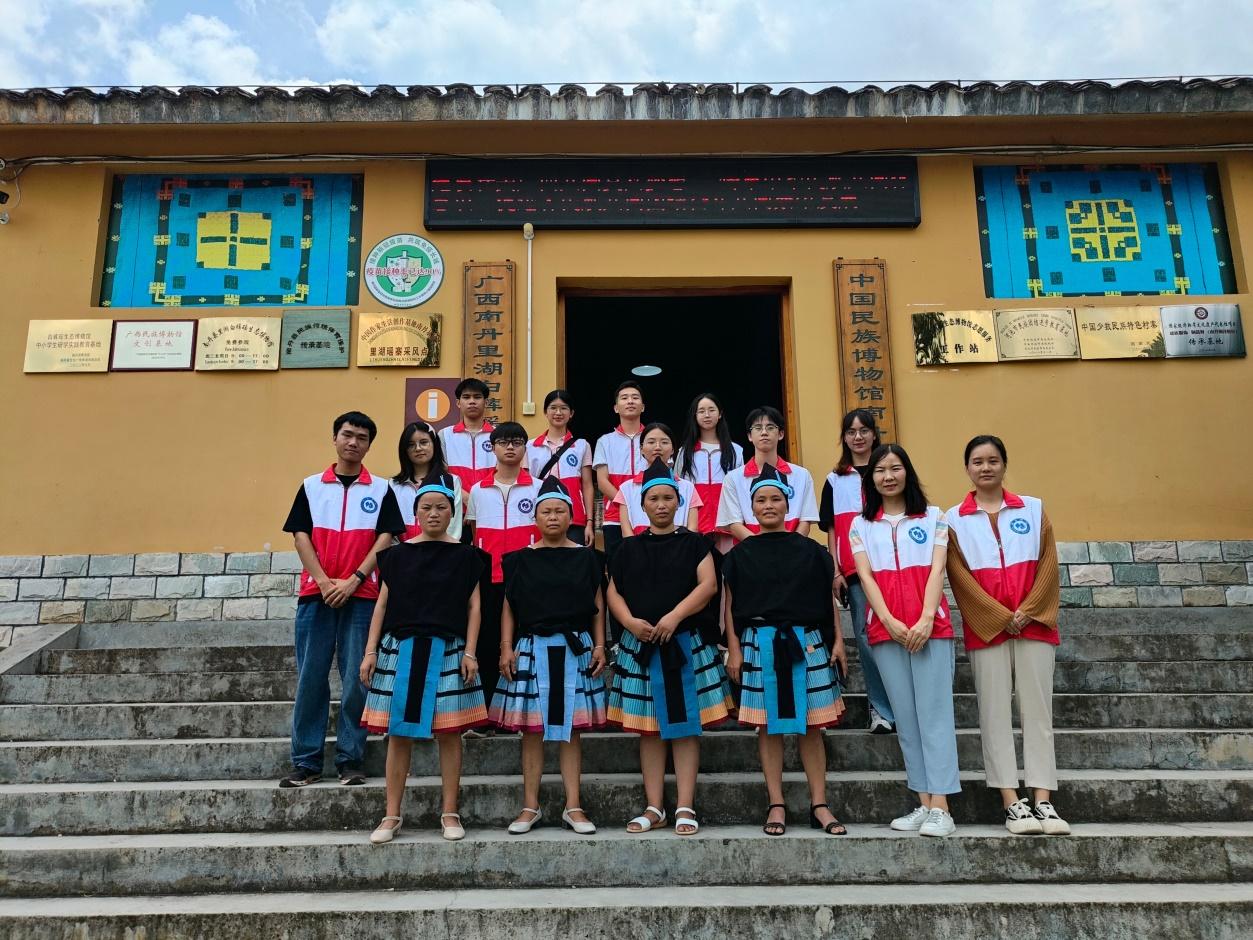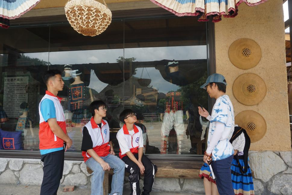 7月13日上午,先锋队前往南丹县里湖瑶族乡朵努社区的“瑶望天下”景区。在白裤瑶民族文化的“赋能”下,景区打造全国为数不多的“移民搬迁+民俗文化+全域旅游”的发展新模式。步入“瑶望天下”景区,景区的白裤瑶非遗文化展演队便以铜鼓齐奏、细话歌齐唱等表演热情迎接。队员们参观了目前已建成的瑶王府、瑶王广场、花桥、街圩、民俗商铺等。根据工作人员介绍,队员们了解到白裤瑶服饰文化是伴随着人类社会发展而逐渐发展、完善起来的,其从最初的实用功能逐渐演变到装饰美化的作用。景区内设有白裤瑶非遗服饰制作技艺展示平台,由当地白裤瑶妇女给游客进行动态制作展示。队员们参观了服饰制作流程中的跑纱、绞纱、压棉、刺绣、粘膏画动态制作展示,深深感受到了白裤瑶服饰的制作工艺的复杂。先锋队希望后期能够将自身专业与民族文化相结合,通过整理纹案和造型、研发文创产品、拓展销售渠道等方式,与非遗传承人交流合作,帮助白裤瑶民族文化焕发新的生机活力。