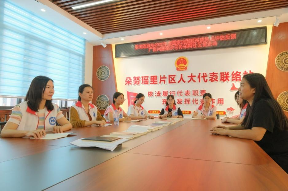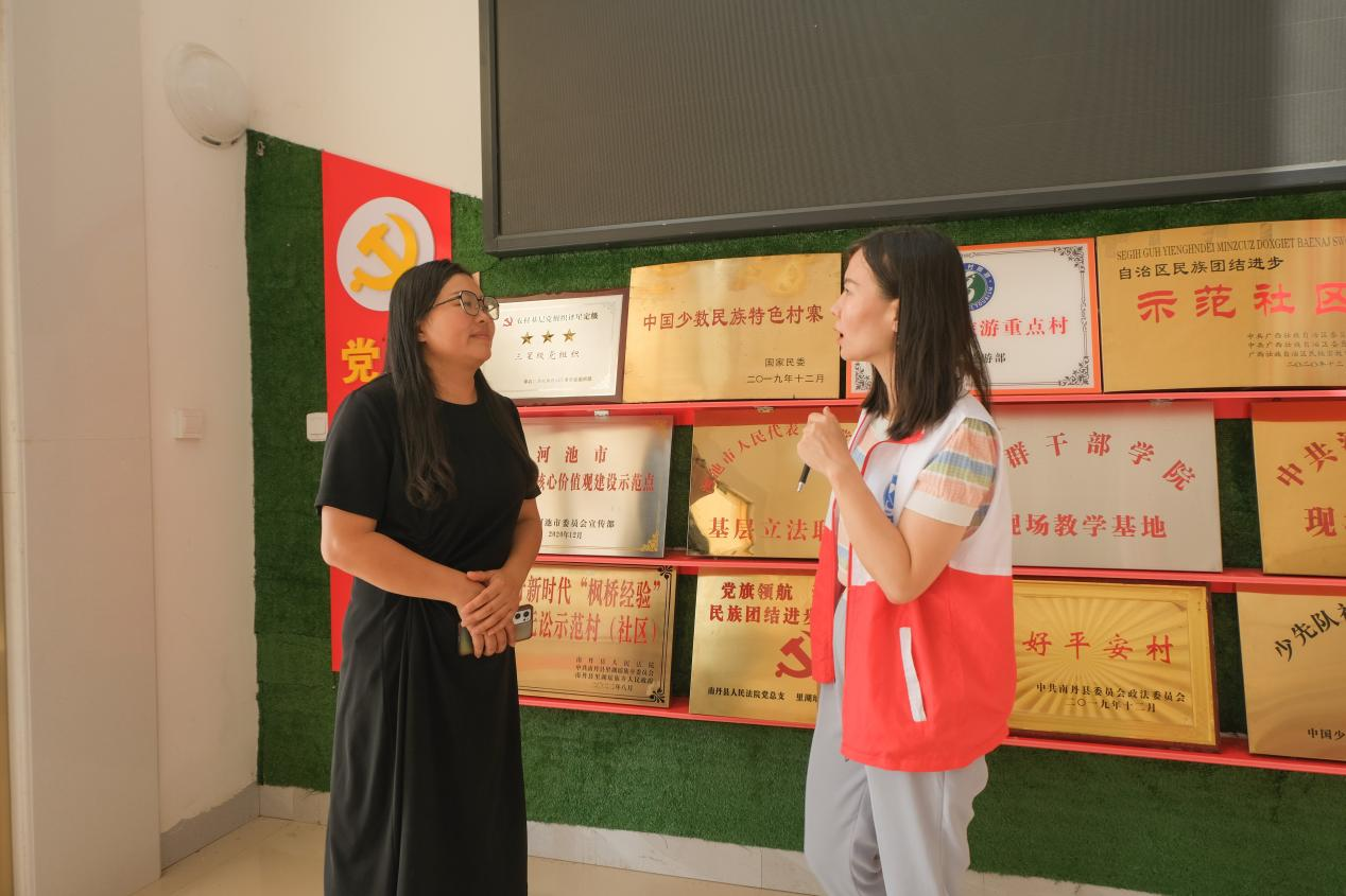 7月12日,先锋队前往 “千家瑶寨·万户瑶乡”白裤瑶易地搬迁点——朵努社区进行调研学习。到达朵努社区党群服务中心后,队员们与驻村第一书记——黎夏书记开展座谈会。黎书记介绍了“千家瑶寨·万户瑶乡”异地扶贫搬迁项目内容及乡村振兴规划措施。黎书记还表示,为了丰富白裤瑶社区特色文化内容,后期将会把白裤瑶民族文化融入社区建设当中,比如社区建筑墙体的绘制、民宿内部的设计、手工艺品的制作等等。会议结束后,队员们参观了社区的陀螺体验馆。陀螺传承人韦老师向队员们展示了花样陀螺的技艺:掌心旋转、指尖旋转、脚尖旋转、身体游走、旋转抛接等。接着,黎书记带领全体队员一同参观了社区内的“南丹县铸牢中华民族共同体意识宣传教育实践基地”。教育实践基地介绍了南丹县建成的十大田园综合体和十大核心景区,以高质量建设引领高质量发展,实现了从“站起来”“富起来”到“强起来”的担当与力量。