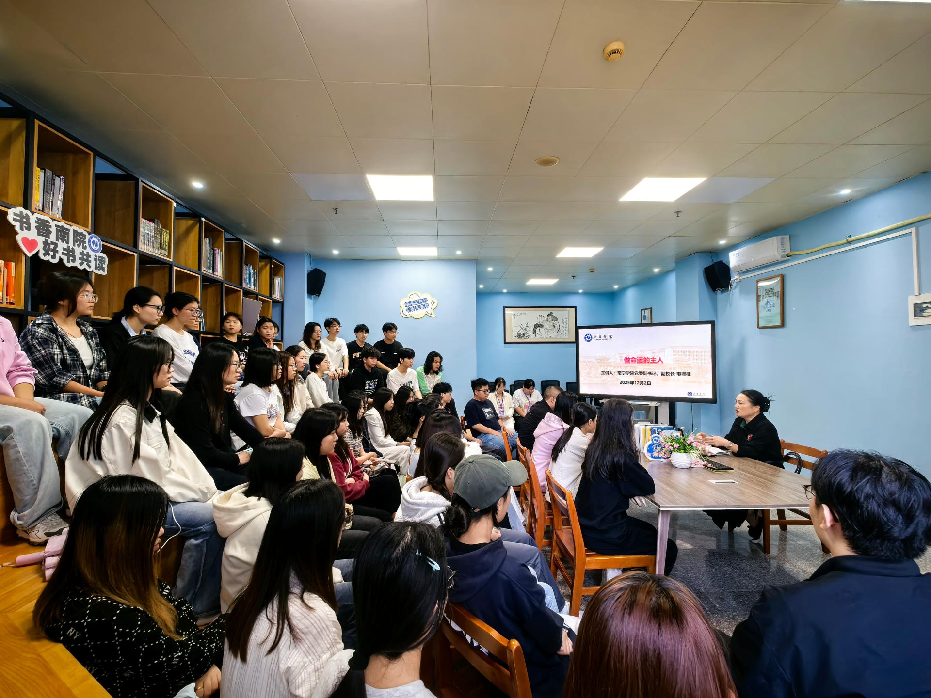 为助力南院学子树立崇高的人生理想与正确的价值观,推动个人成长与自我超越的步伐,12月2日下午,在图书馆二楼阅读分享空间举办了《了凡生意经》师生共读沙龙。此次活动由qm球盟会党委副书记、副校长韦粤桂主持,在传统智慧与现代认知的激烈碰撞中,共同解锁生命成长的深层密码。来自商学院的50多名师生代表参加。