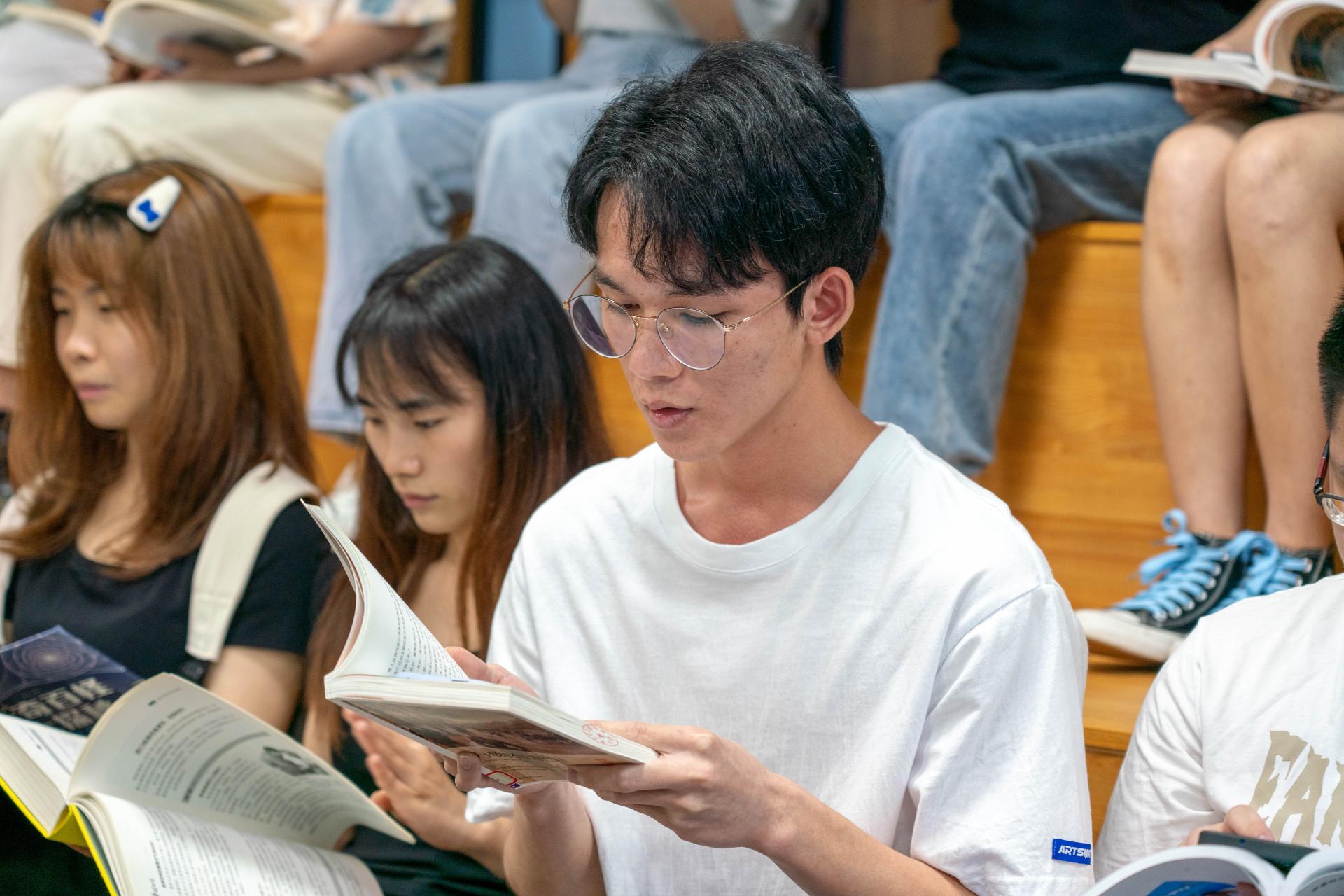 诵读会上,同学们围绕校长荐书学生书单《如何阅读一本书》《时间简史》《平凡的世界》《从一到无穷大》《乡土中国》《红星照耀中国》《生命是什么》《大国崛起》《心理学与生活》《经济学原理》,节选自己最喜欢的一个篇章进行诵读分享。