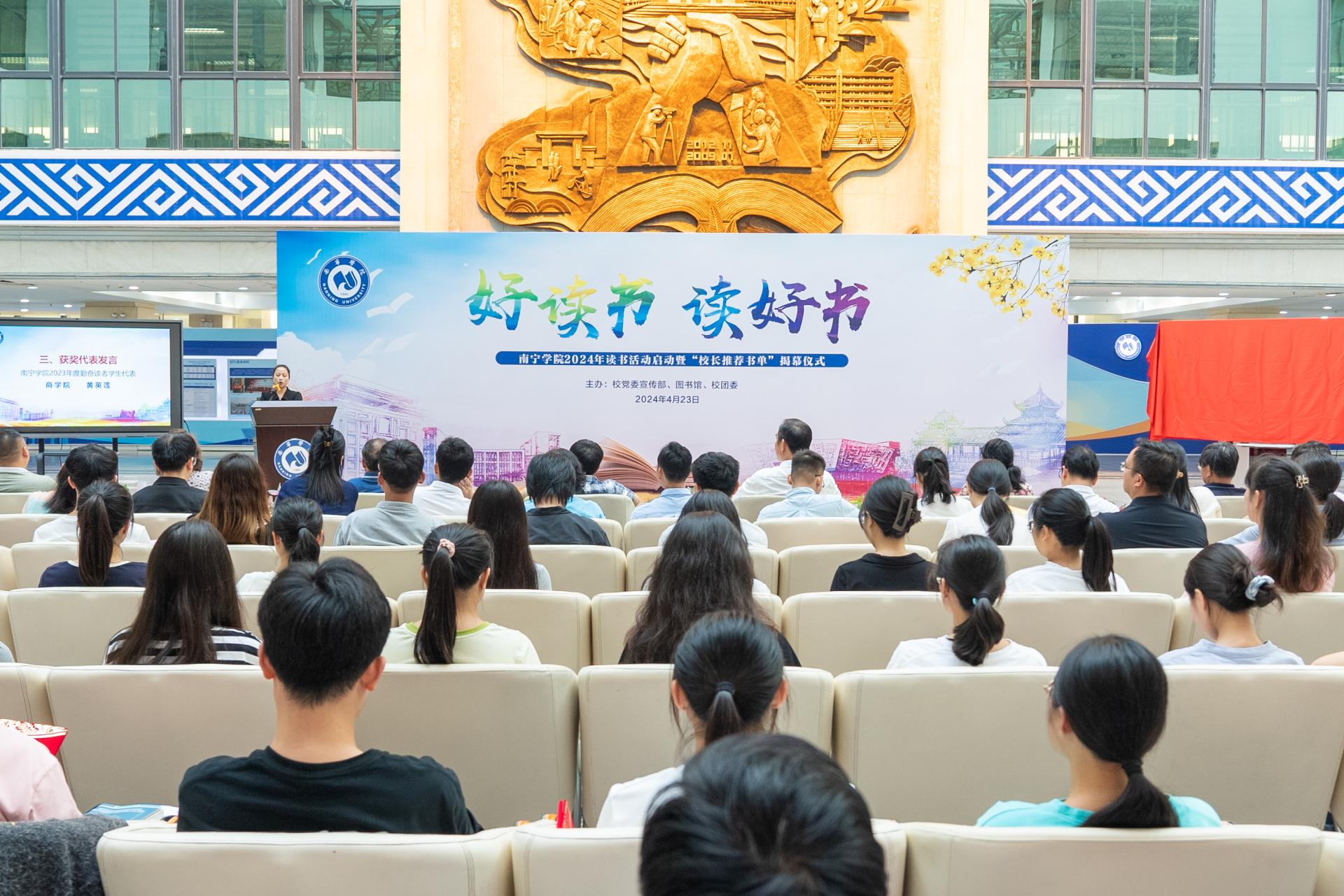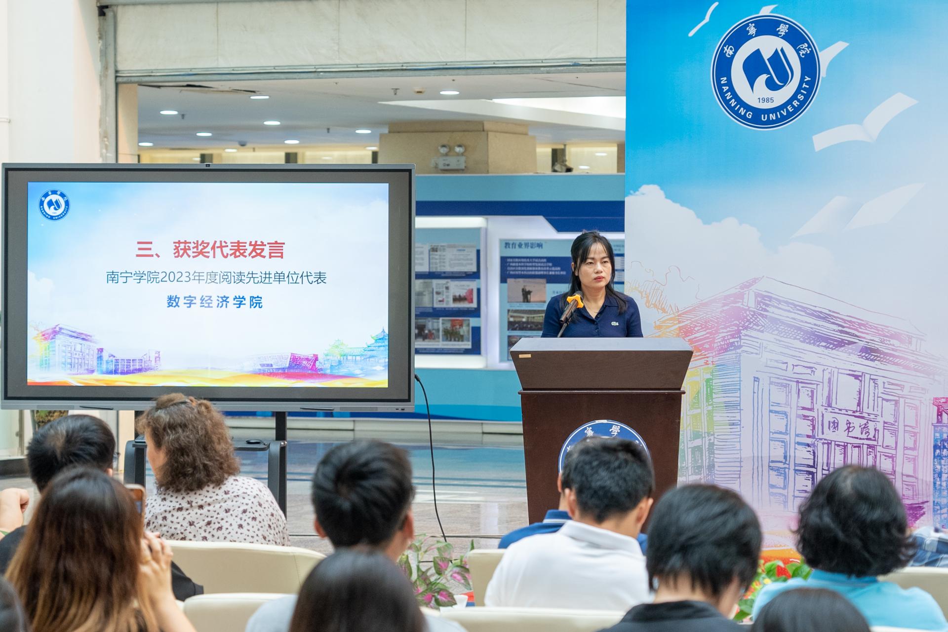 “2023年阅读先进单位”获得单位数字经济学院党总支副书记韦丹代表发言。她说,数字经济学院立足学院的学生生情和专业特色,积极推动阅读文化的发展,充分激发学生读书热情,2023年全院在校生图书借阅量共计29212册,出入图书馆共计43711人次。积极响应“读书沙龙系列活动”等,组织学院学生社团组织、基层班级、青年大学生开展各类读书分享会,5名学生获得2023年度勤奋读者。她希望,师生们能将读书变成一种伴随终身的良好习惯,可以依据自己的爱好、志向,选择自己所喜爱的书籍,选择经典名著来阅读。