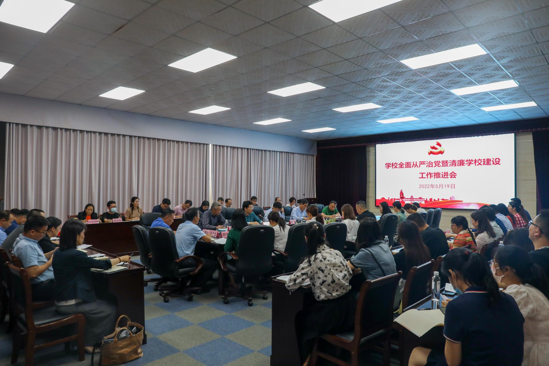 5月19日,学校在大学生活动中心302会议室召开2022年全面从严治党工作暨清廉学校建设推进会,全体校领导,各单位各部门党、政负责人,各二级学院党委(党总支)副书记,各党支部书记参加会议。会议由党委副书记、纪委书记覃存民主持。