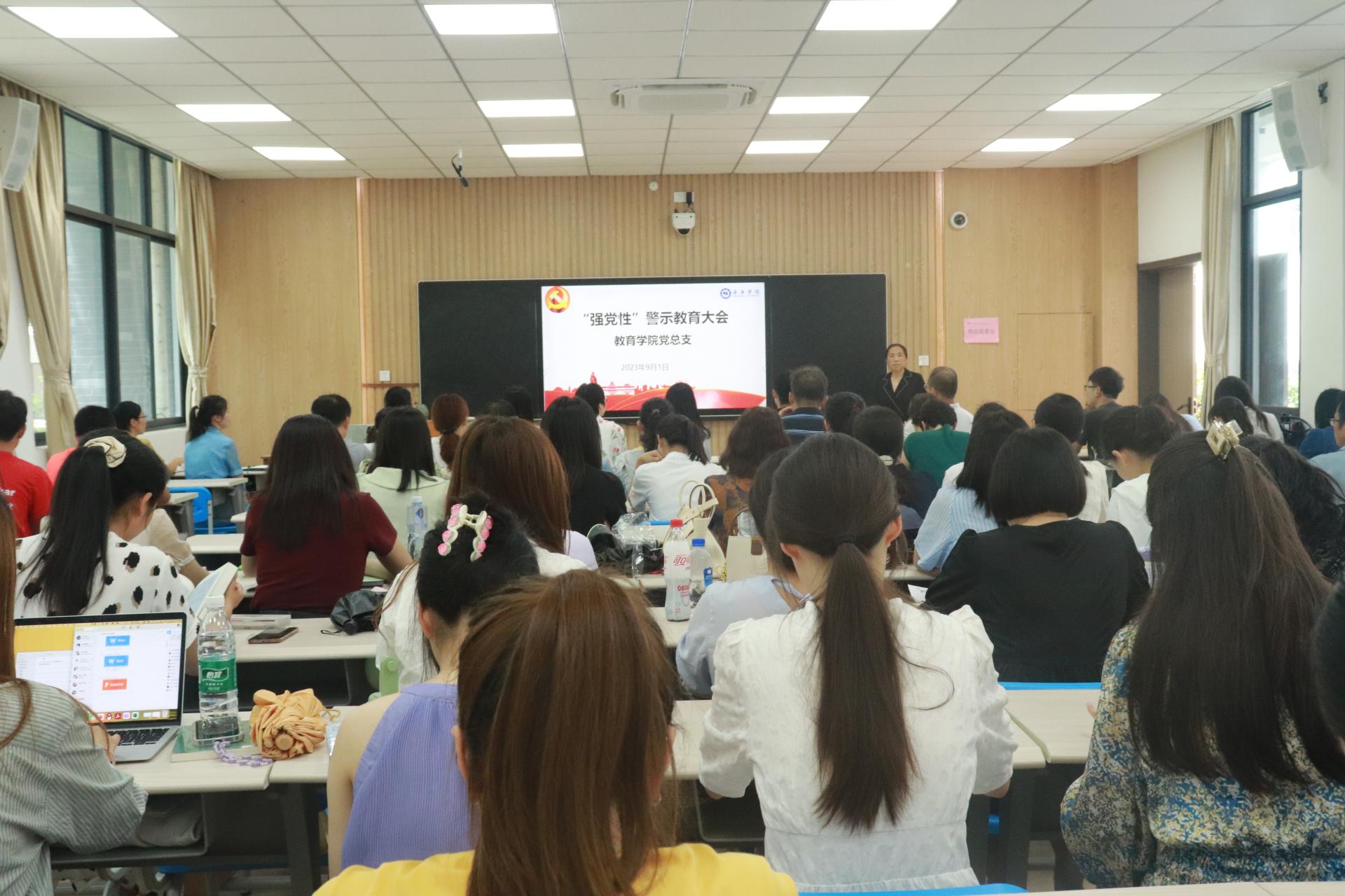 2023年9月1日,教育学院党总支在敷文园A109教室召开“强党性”警示教育大会,大会由党总支书记黄瓅主持,学院全体教师参加了会议。