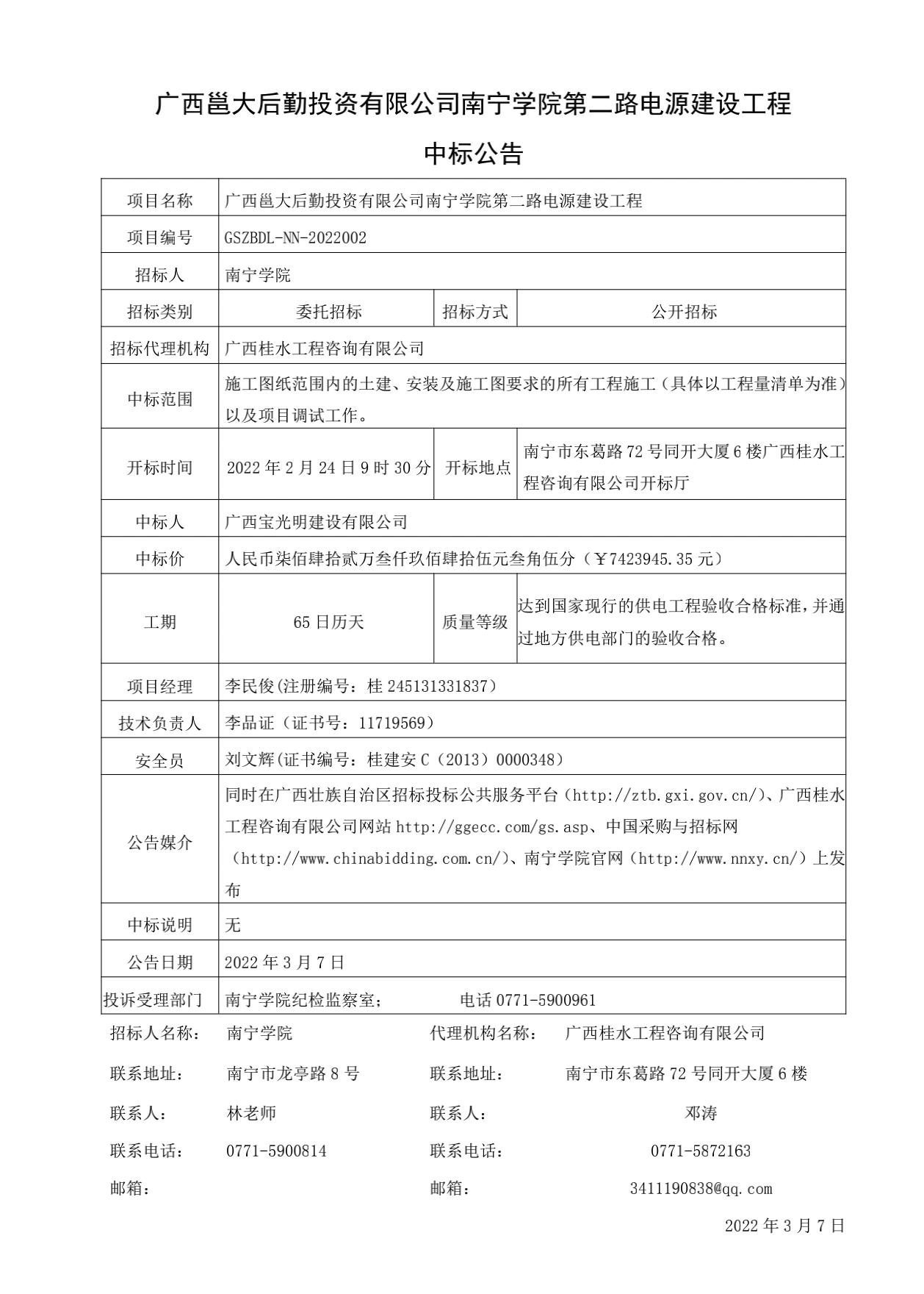 广西邕大后勤投资有限公司qm球盟会第二路电源建设工程 中标公告