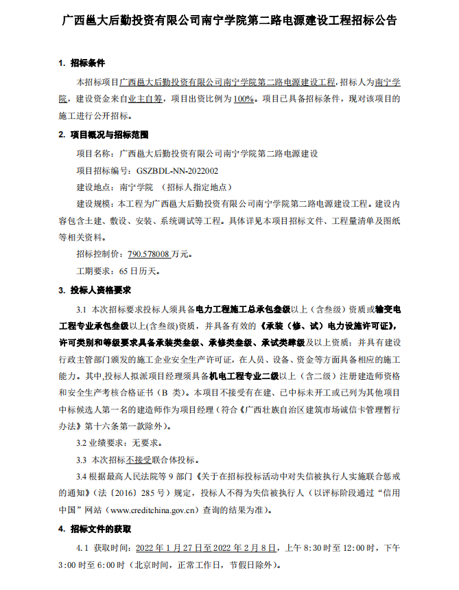 广西邕大后勤投资有限公司qm球盟会第二路电源建设工程招标公告