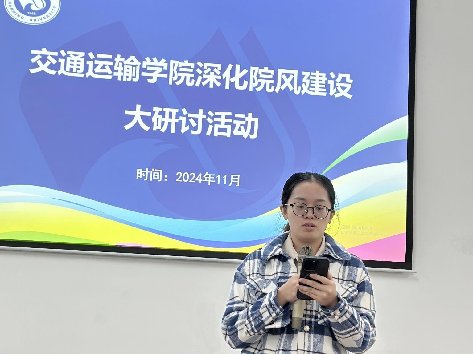 交通运输学院期望通过此次大研讨活动,能够为深化院风建设统一思路,指明道路,落实立德树人根本任务,提升学院的整体管理服务水平和教育教学质量,为培养更多德智体美劳全面发展的高素质人才奠定坚实的基础。学院全体师生将携手努力,以实际行动践行“自强、责任、卓越、有用”的核心价值,为学校的高质量发展贡献力量。(交通运输学院供稿 文/甘宇同 图/滕小丽、蒋东霖、陈珊珊、袁丽丽、甘宇同、张兰芳)