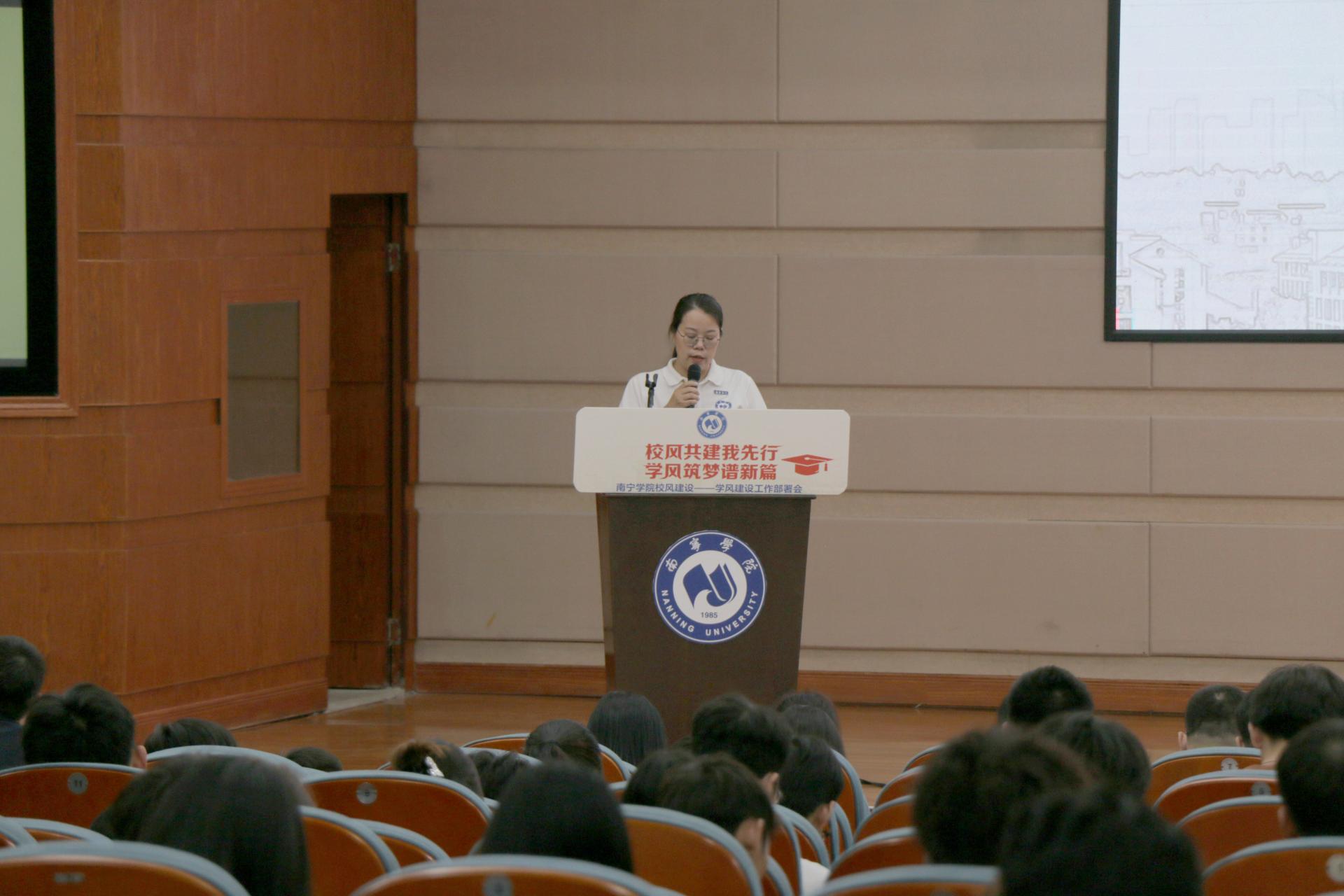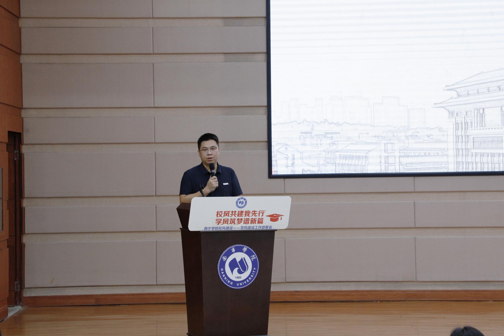 最后,学校党委副书记、副校长韦粤桂在会上作动员讲话,韦副书记强调,一直以来学校高度重视校风建设,特别是学风建设工作,优良的学风是学校高质量办学的重要体现,学风建设能够促进学校教学质量的提升,教学相长,能推动高校教育事业持续健康发展。韦副书记在会上还举例了一些校内事件案例,指出当前学风建设工作当中仍存在的问题,希望全体师生能够学会“把脉”,找出学风建设中的“病症”并加以改之,提高认识、真抓实干,为学校形成良好的校风共同努力。