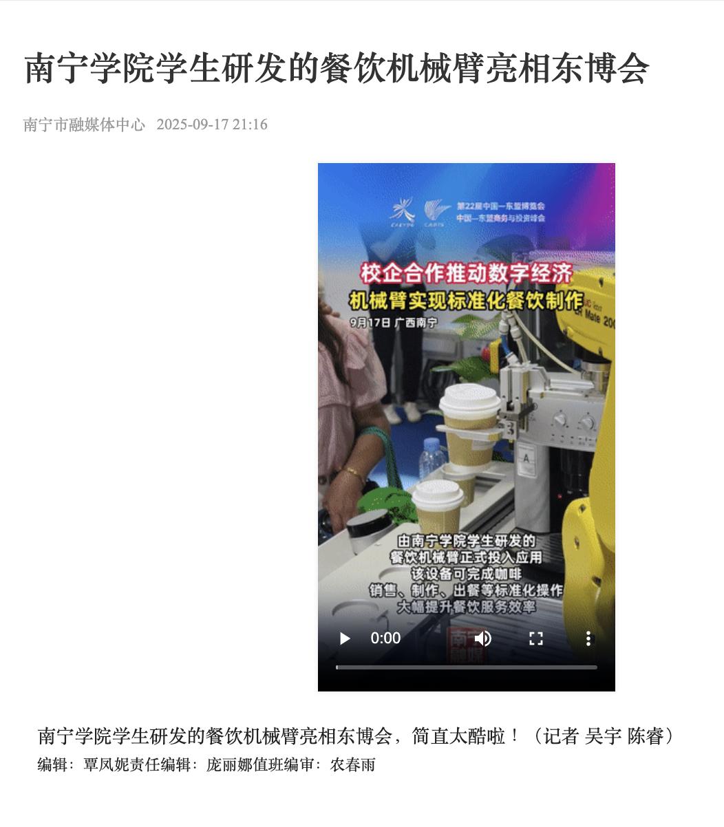 1.南宁电视台qm球盟会学生研发的餐饮机械臂亮相东博会 https://jxpub.nntv.cn/s/202509/17/AP68cab49e5e0e4095577f7a3f.html