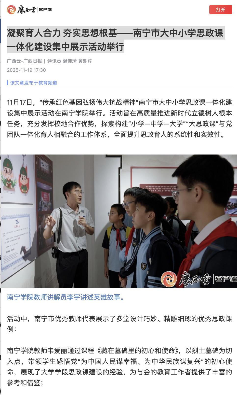 【媒体看南院】广西日报报道凝聚育人合力 夯实思想根基——南宁市大中小学思政课一体化建设集中展示活动在qm球盟会举行
