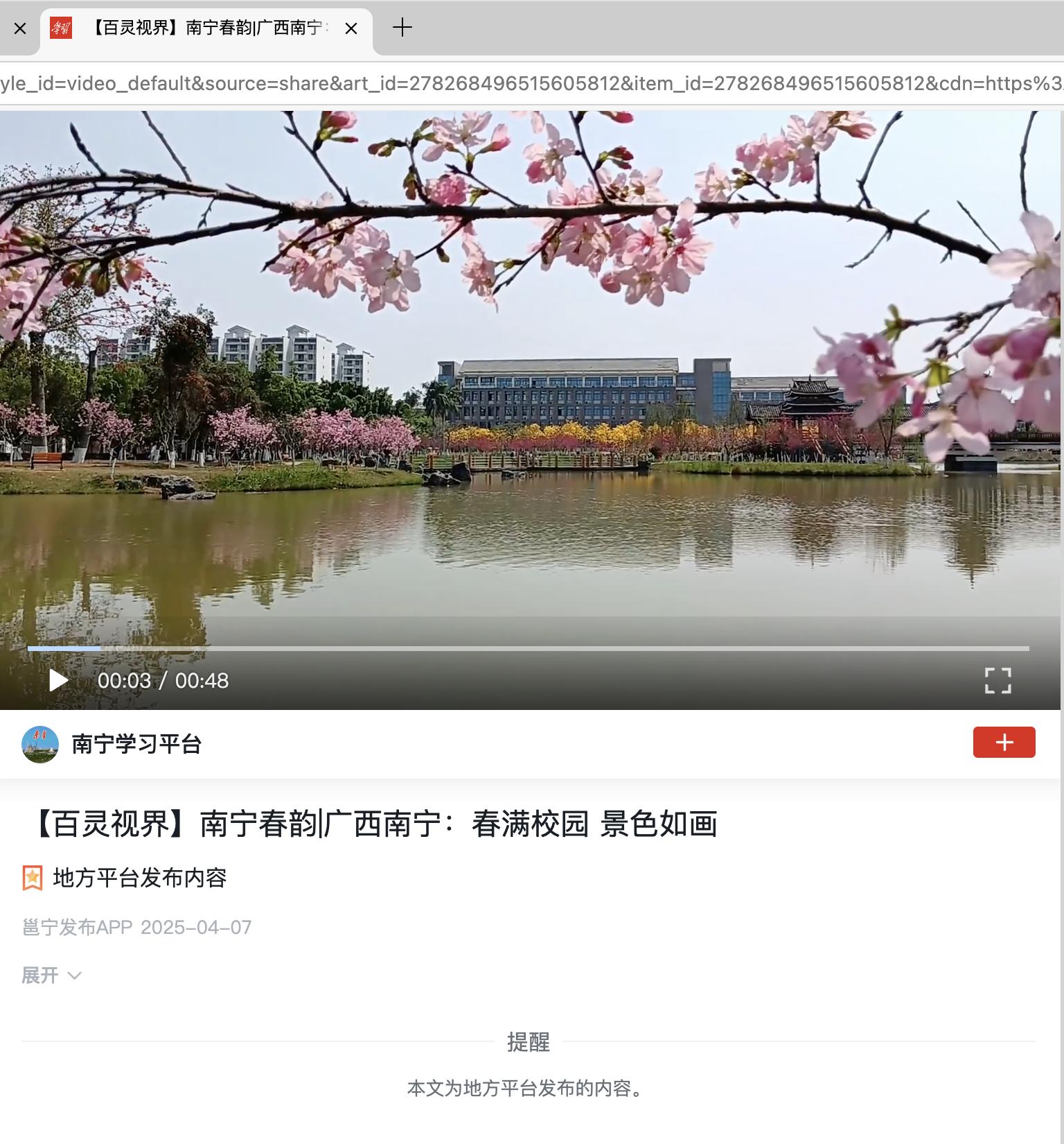 2.学习强国:【百灵视界】南宁春韵|广西南宁:春满校园 景色如画 https://article.xuexi.cn/articles/index.html?share_to=wx_single&study_style_id=video_default&source=share&art_id=278268496515605812&item_id=278268496515605812&cdn=https%3A%2F%2Fregion-guangxi-resource