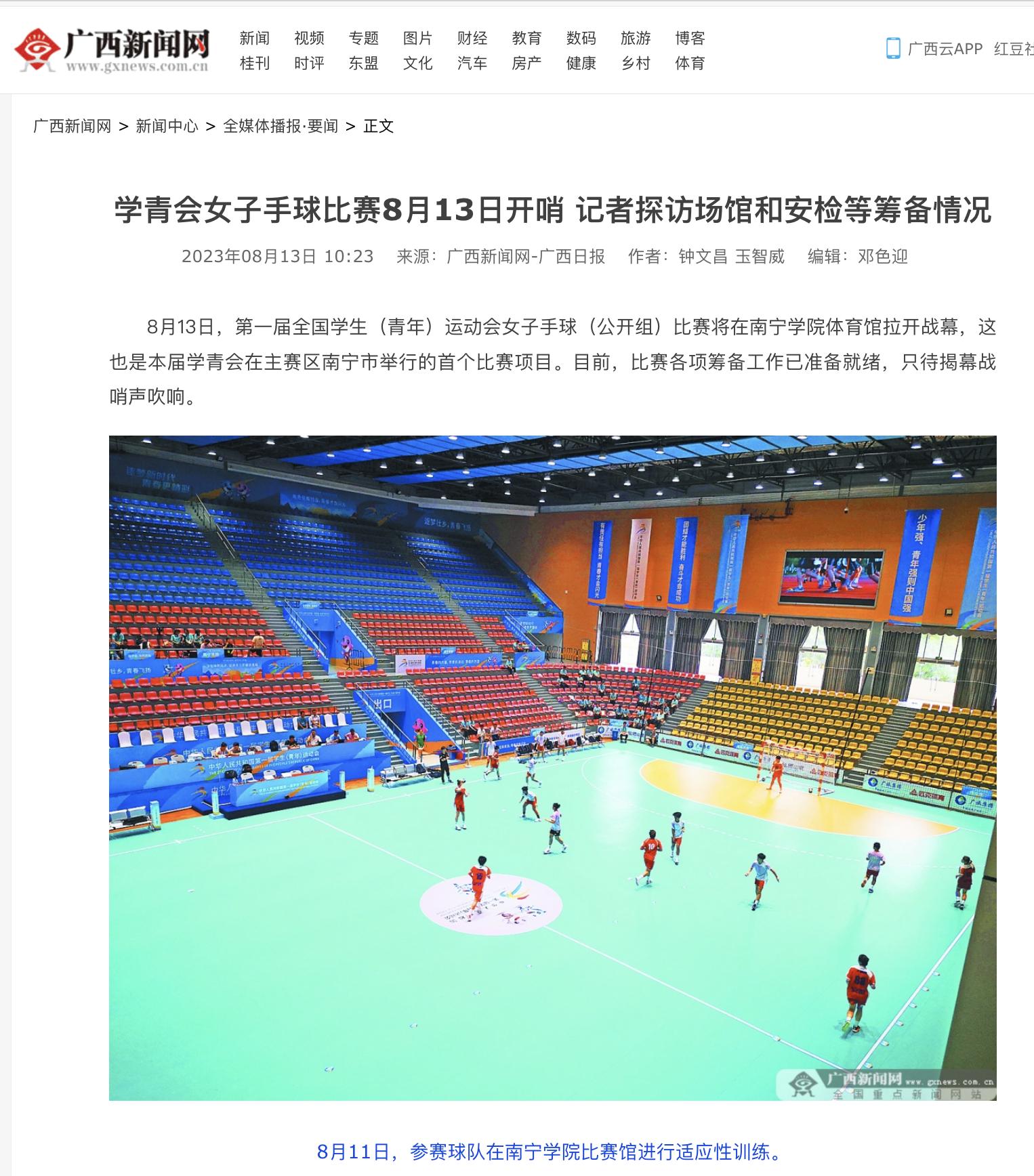 【媒体看南院】南宁晚报报道以赛测赛!qm球盟会学青会手球场馆准备就绪