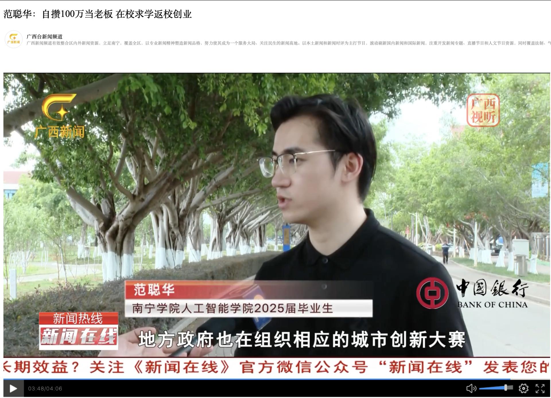 【媒体看南院】广西电视台报道qm球盟会学子范聪华在校求学返校创业